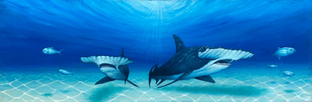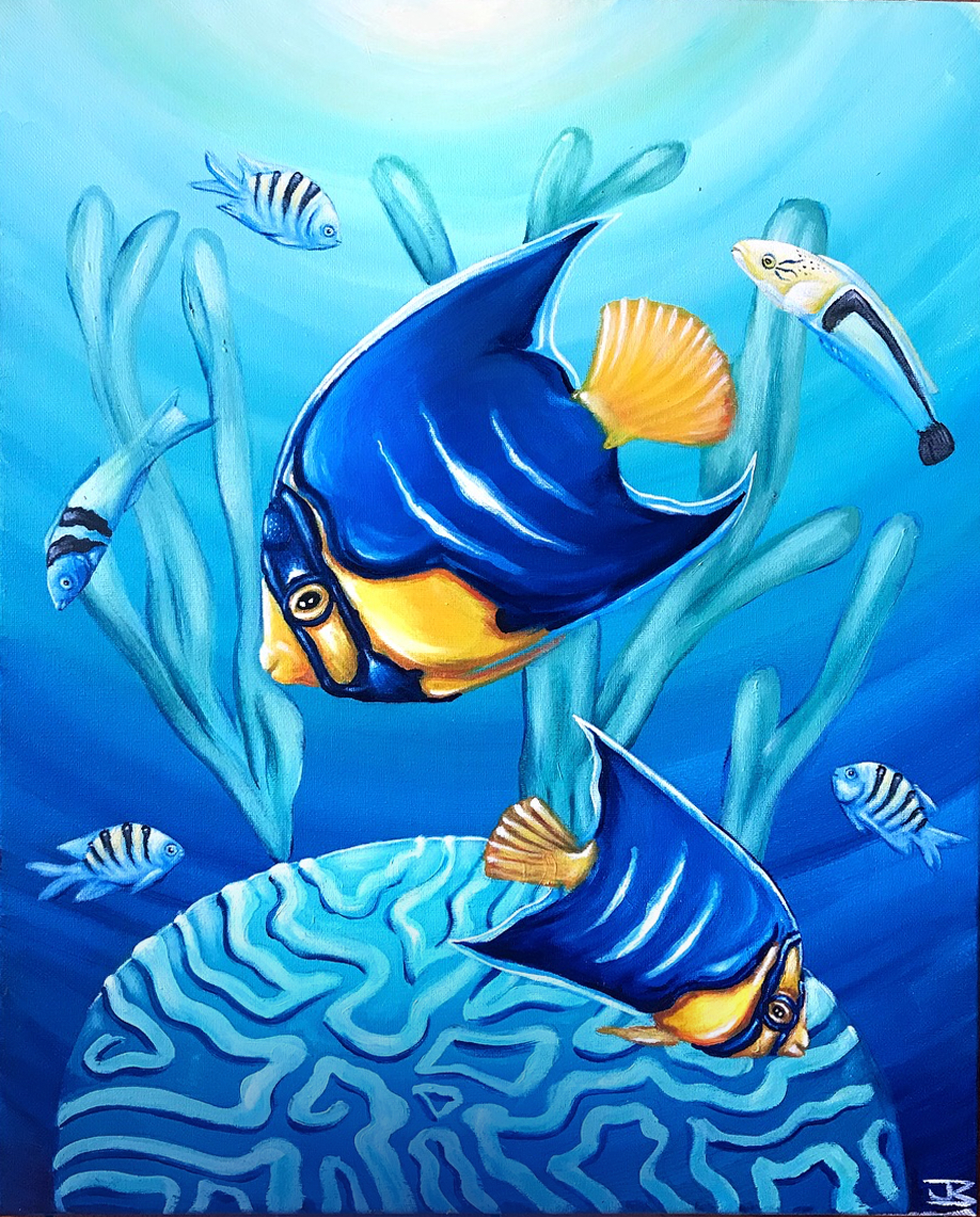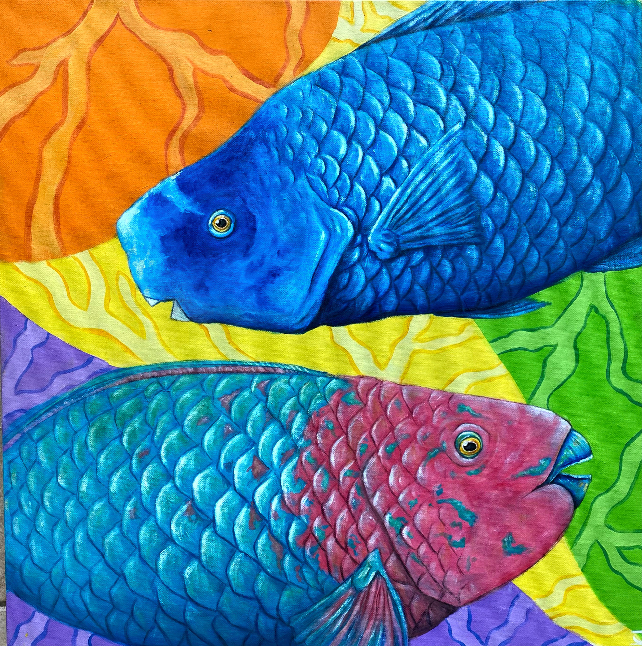 A selection of Jack Kelly’s original marine life paintings. Jack primarily works with acrylic on canvas and utilises bright colors and contrasts to make his paintings pop and produce a tropical vibe, reflecting the environment where he lives and works.